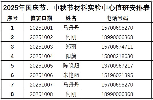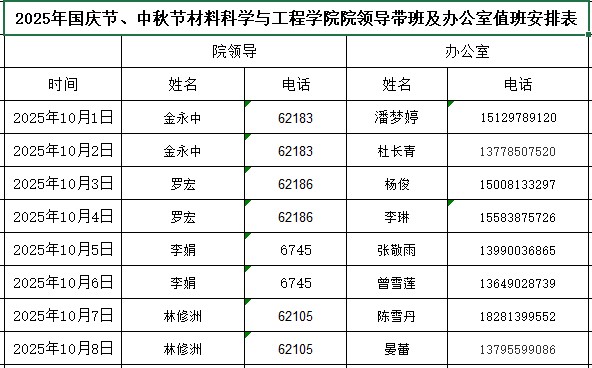 2025年国庆节、中秋节材料科学与工程学院院领导带班及办公室、材料实验中心值班安排表