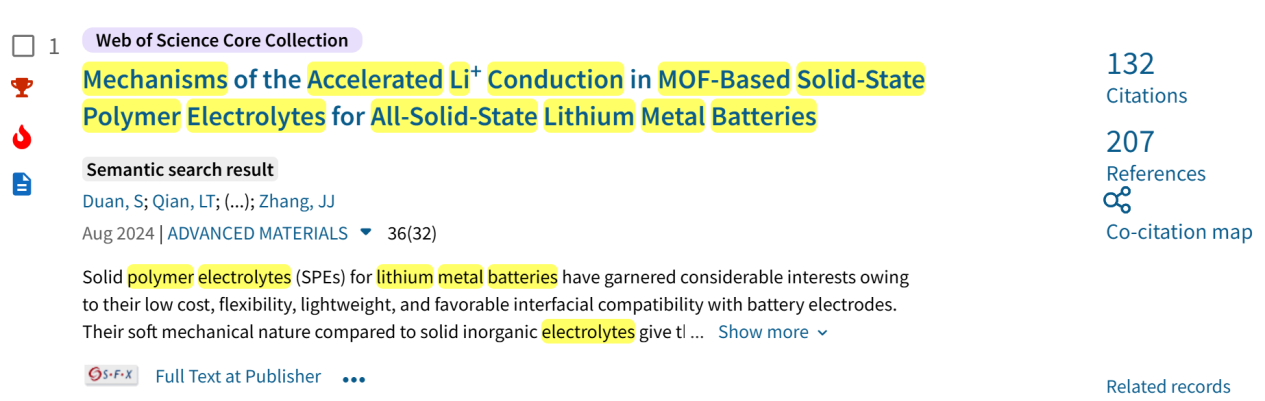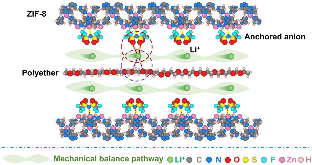 聚合物电解质因其易于加工和优越的电极界面相容性而被广泛应用于锂金属电池,但由于强Li+−聚合物相互作用和曲折的离子传输途径,其离子电导率本质上较低。受物理学中“力学平衡(MB)”原理的启发,段松校友提出了一种创新策略,包括构建一个MB区,在这个MB区中,通过MOF锚定的阴离子簇对Li+的作用力来平衡Li+−聚合物的强相互作用,使Li+在聚合物电解质中形成极弱的配位态,并且进一步通过结构设计将这些MB区连接,实现了电解质中Li+的短距离、近乎无摩擦的快速传输。
