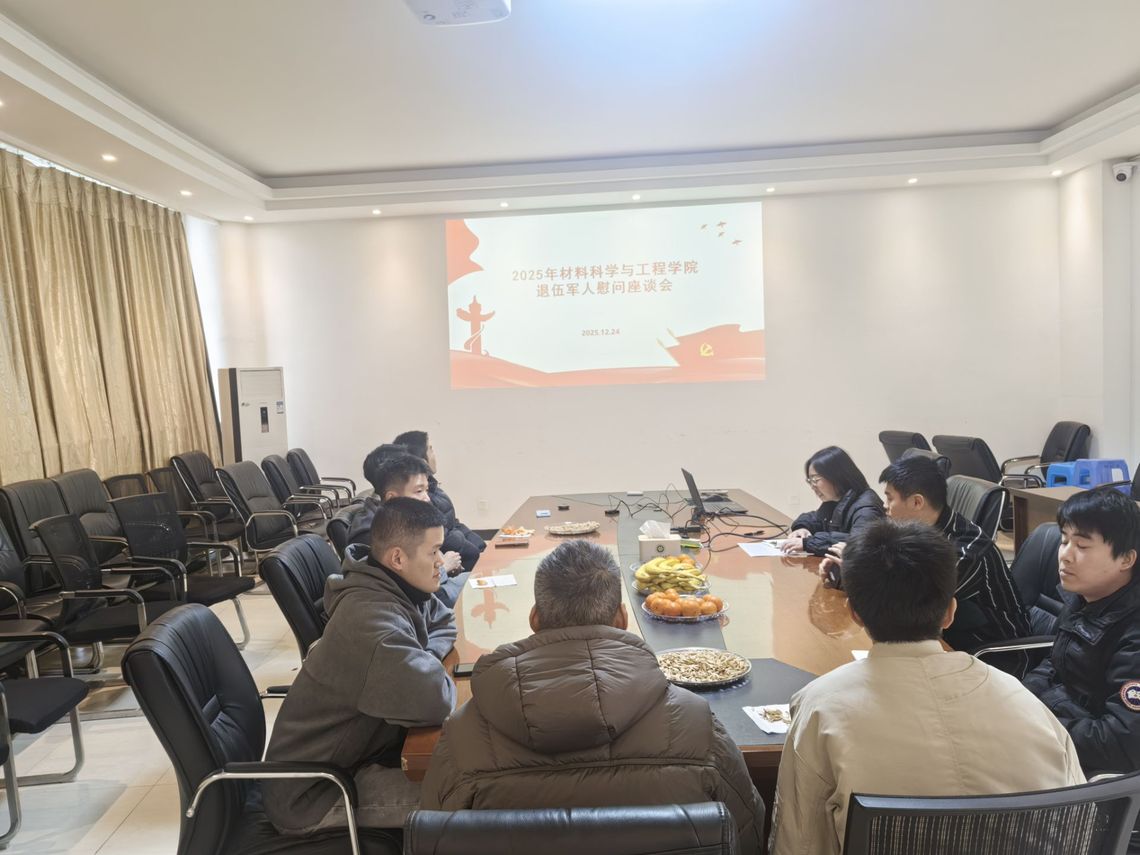 为深入贯彻落实拥军优属政策,弘扬爱国主义精神和优良军人作风,切实关怀学院退伍军人学子的学习与生活,12月24日下午,材料科学与工程学院在第二实验楼4086会议室隆重召开退伍军人慰问座谈会。学院党委副书记李娟、学工办主任杜长青及全体退伍军人学子参加会议。
