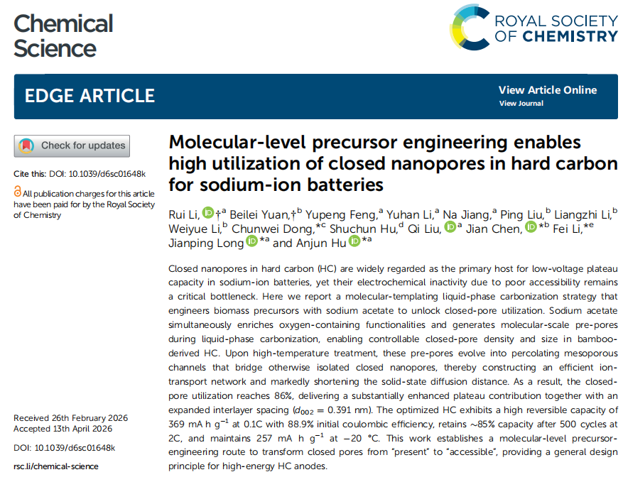 硬碳材料因其低成本、高理论容量和优异的循环稳定性,被广泛认为是钠离子电池最具前景的负极材料。然而,硬碳中闭孔的低利用率和较差的离子可及性,长期以来限制了其低电压平台容量的充分发挥。受分子工程思想的启发,李瑞博士和陈建教授团队提出了一种分子模板液相碳化策略,通过在生物质前驱体中引入乙酸钠,在液相碳化过程中同时富集含氧官能团并构建分子尺度的“预孔隙”。这些预孔隙在高温碳化过程中演化为贯穿性的介孔通道,将原本孤立的闭孔连接成高效的离子传输网络,显著缩短了Na+的固相扩散距离。
